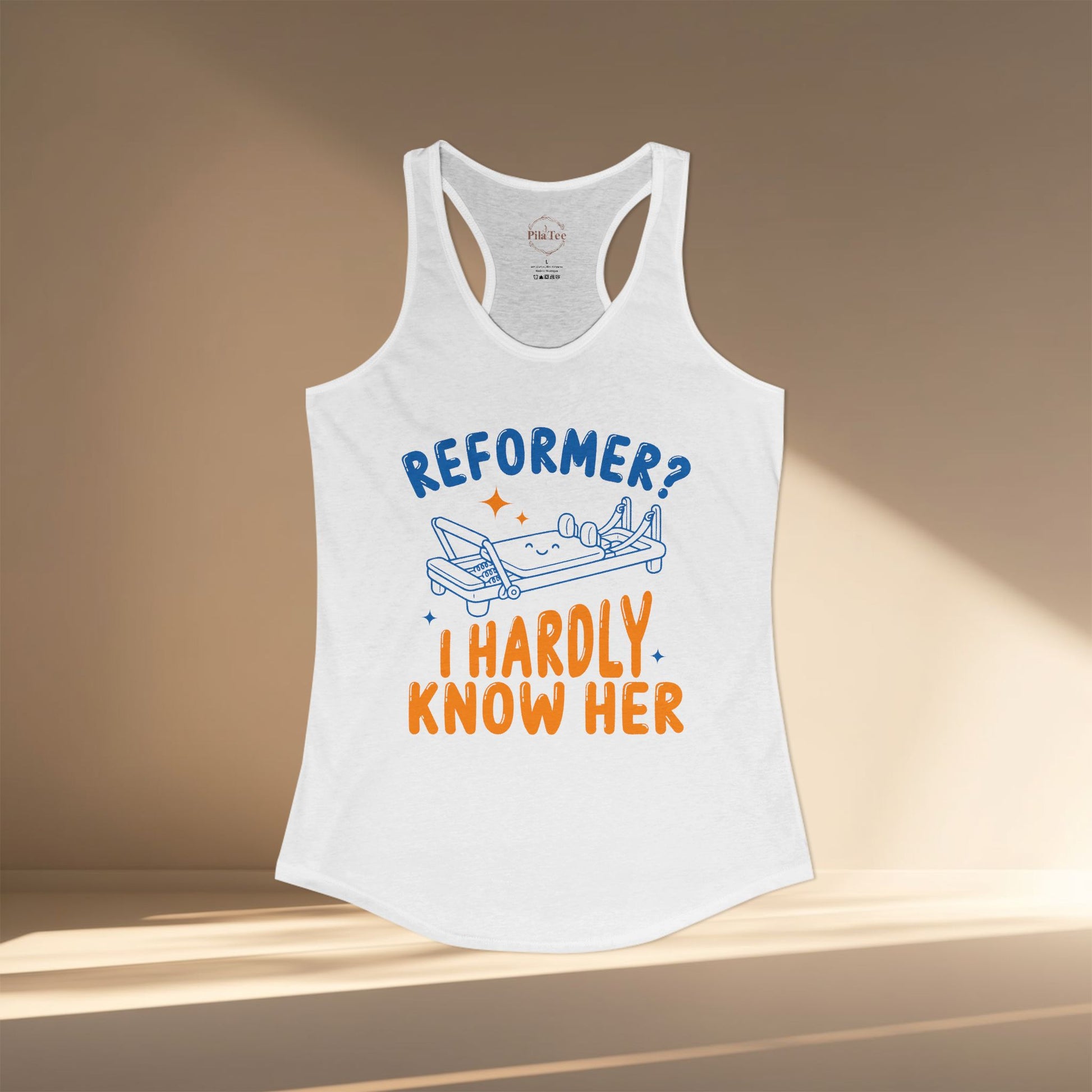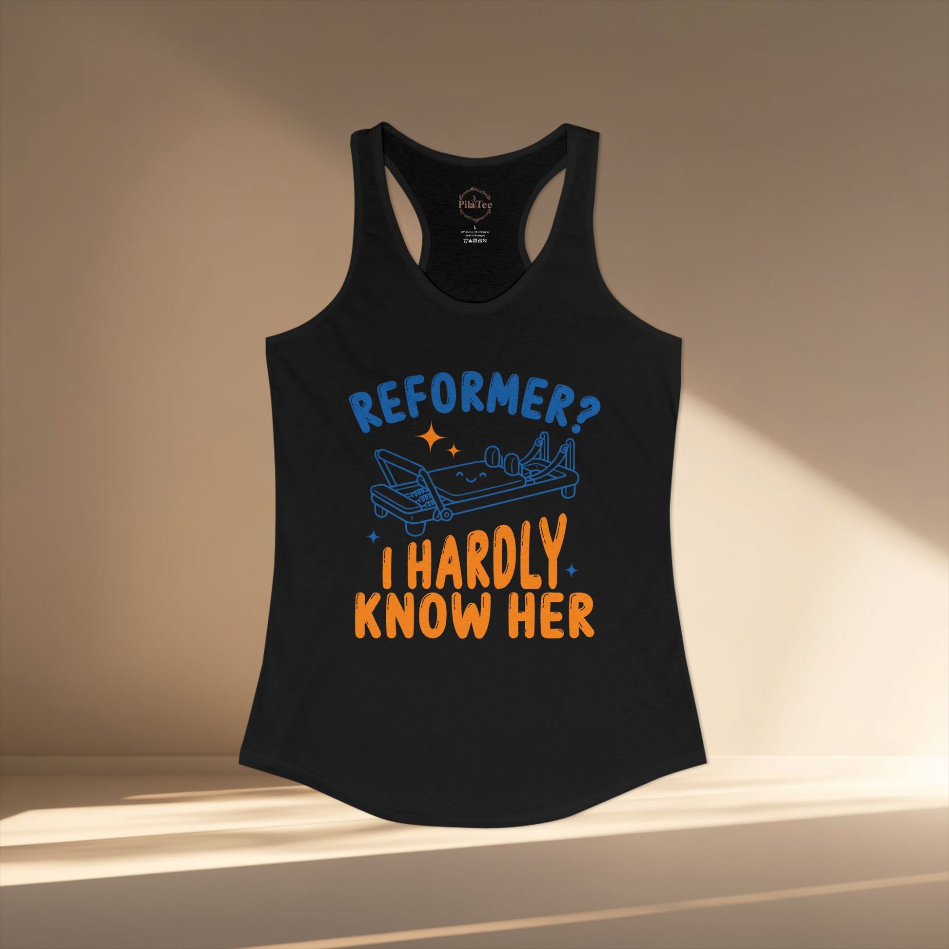 Serve humor and reformer energy with the “Reformer? I hardly know her” racerback, designed for anyone who loves a cheeky Pilates joke. The soft, stretchy feel pairs with a clean silhouette to keep you comfortable through every move. It’s a playful staple that stays fresh with a long-lasting print.